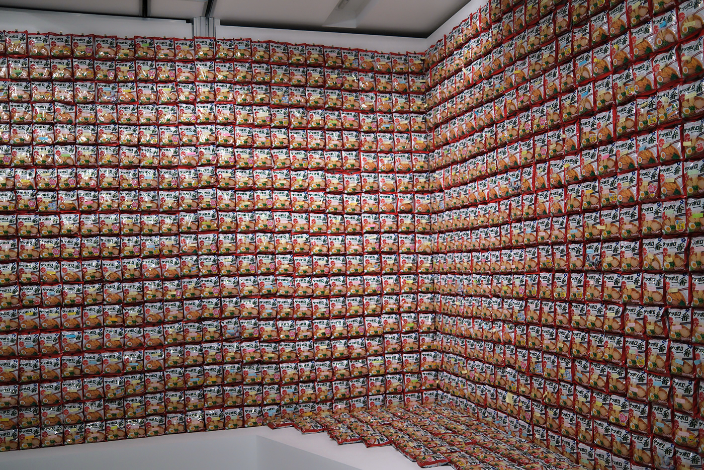 also, a huge wall of ramen packets that have been diligently massaged over the course of a day by a young woman, which she would return at the end of the day and receive a brand new packet the next morning.